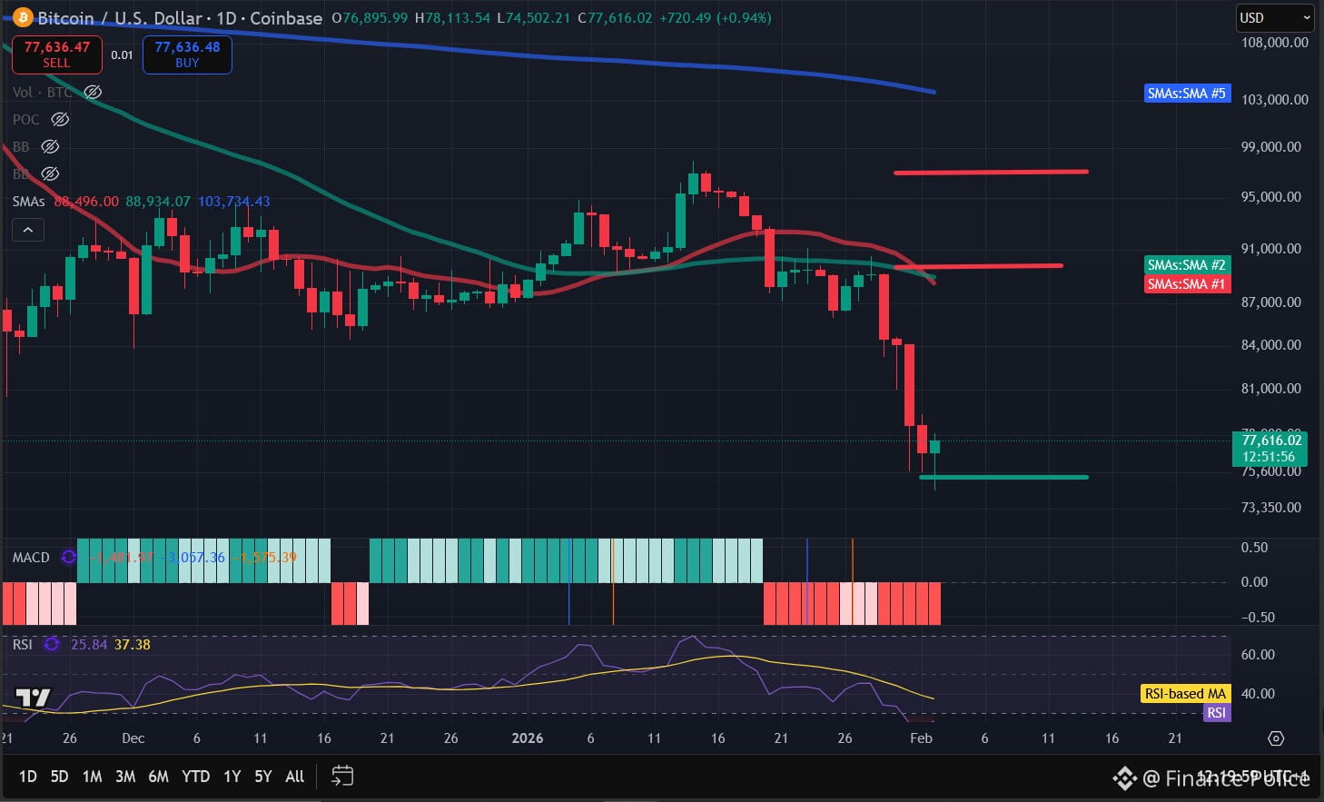 Bitcoin (BTC) slumped to a low of $74,502 on Coinbase early on Monday as the crypto market selloff continued unabated. The downtrend has seen BTC lose nearly $800 billion since hitting its all-time high of $126,000 in October 2025. It also knocked the flagship cryptocurrency out of the global top ten assets, as crypto liquidations hit $2.6 billion.