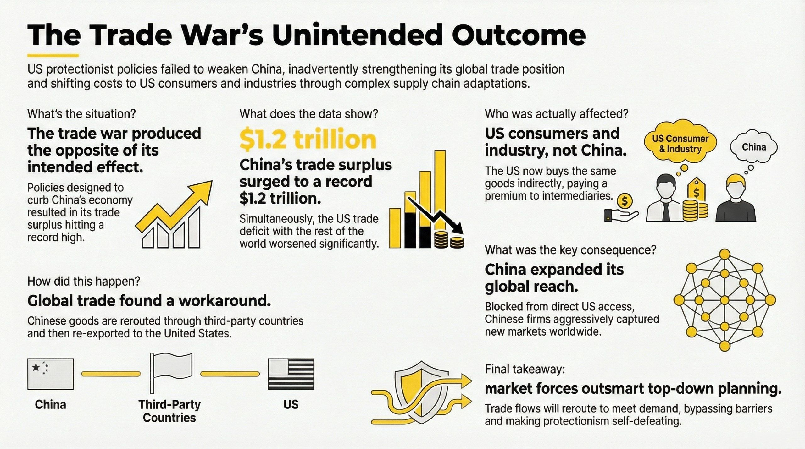 Resultado: Uma Mudança de Direto para Indireto. Embora o déficit comercial direto entre os EUA e a China tenha diminuído—uma métrica superficial frequentemente citada como uma vitória—isso ocultou uma realidade muito mais significativa. As compras indiretas dispararam à medida que o mercado se adaptou, significando que os EUA agora estão comprando os mesmos produtos chineses, mas encaminhados através de países terceiros e a um prêmio.