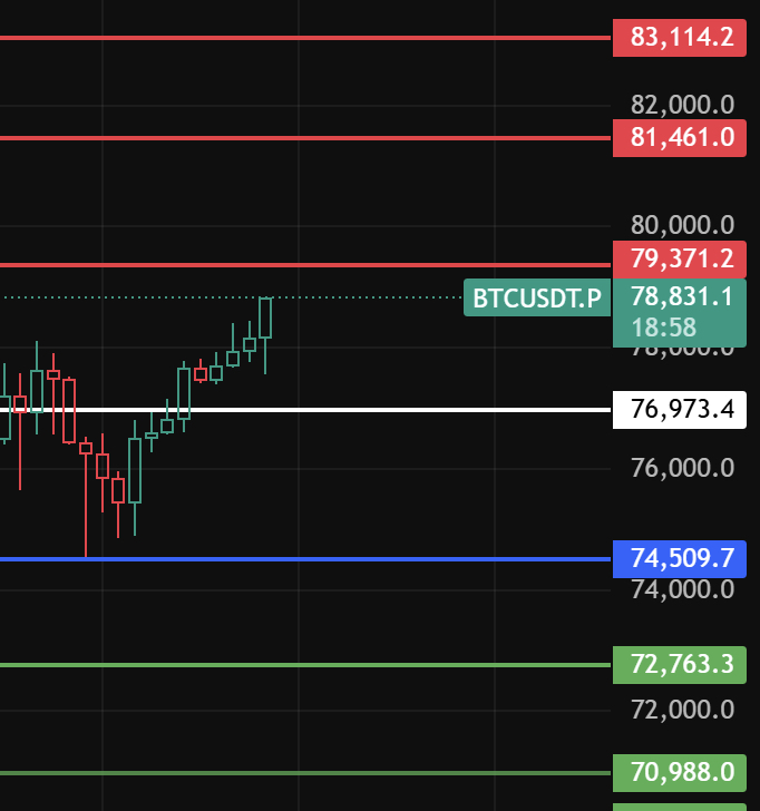 Atenção ao nível 77000 de Bitcoin durante a noite; desde que não quebre esse nível em uma correção, a reação de 1-2 horas continuará. O nível de resistência acima deve observar 79370-81460-83115!