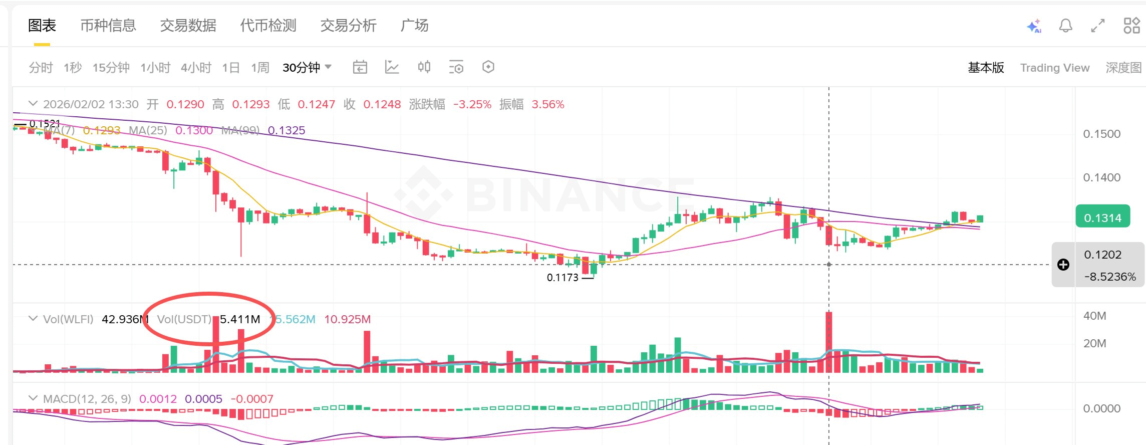 A recompensa da atividade do Irmão Feng foi recebida hoje ao meio-dia às 13h31, e todos devem ter recebido nesse horário. Pode-se ver que aqui no gráfico de 30 minutos do WLFI há um volume de negociação considerável, mas apenas 5,41 milhões de dólares de volume de negociação.