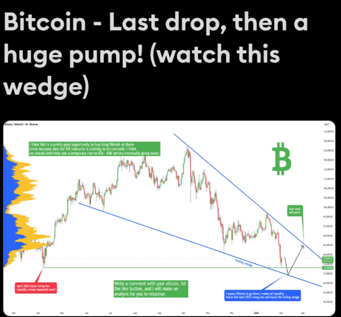 O Bitcoin está atualmente sendo negociado a cerca de 78.000 no momento em que escrevo este artigo, e espero que o preço caia para 71k - 72k a curto prazo. Por quê? Como podemos ver no gráfico, há muitas razões pelas quais o Bitcoin deve cair. A primeira razão é que as baleias (bancos, instituições) ainda não varreram a liquidez abaixo do mínimo de abril de 2025. Este é um ponto de interesse enorme, pois muitos traders de varejo têm seus stops exatamente abaixo desse mínimo. A segunda razão é que o preço deve tocar a linha de tendência descendente do triângulo em queda.
