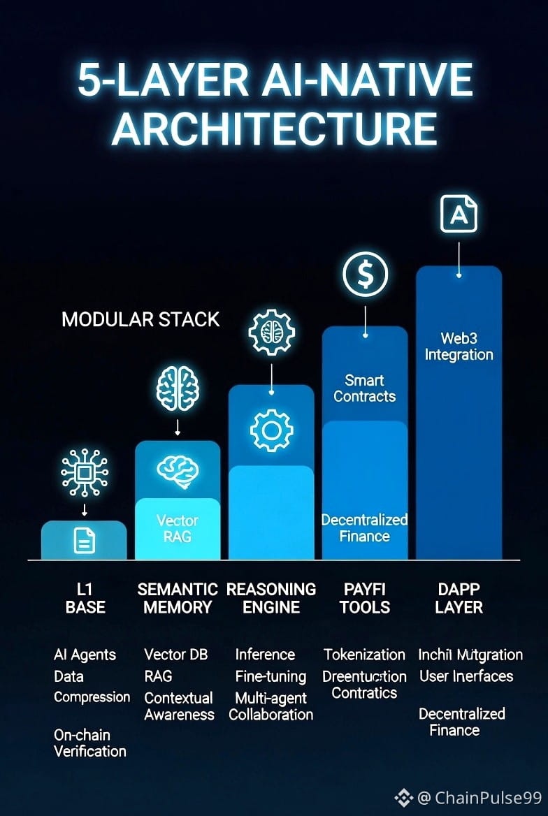 At its core, Vanar Chain features a modular 5-layer architecture designed specifically for AI workloads. This includes semantic memory for storing contextual data on-chain, on-chain reasoning capabilities, and tools that allow dApps to learn, adapt, and evolve autonomously over time. Unlike retrofitted solutions on other chains, intelligence is baked into the protocol level, enabling seamless support for AI agents, decentralized decision-making, and dynamic applications.
