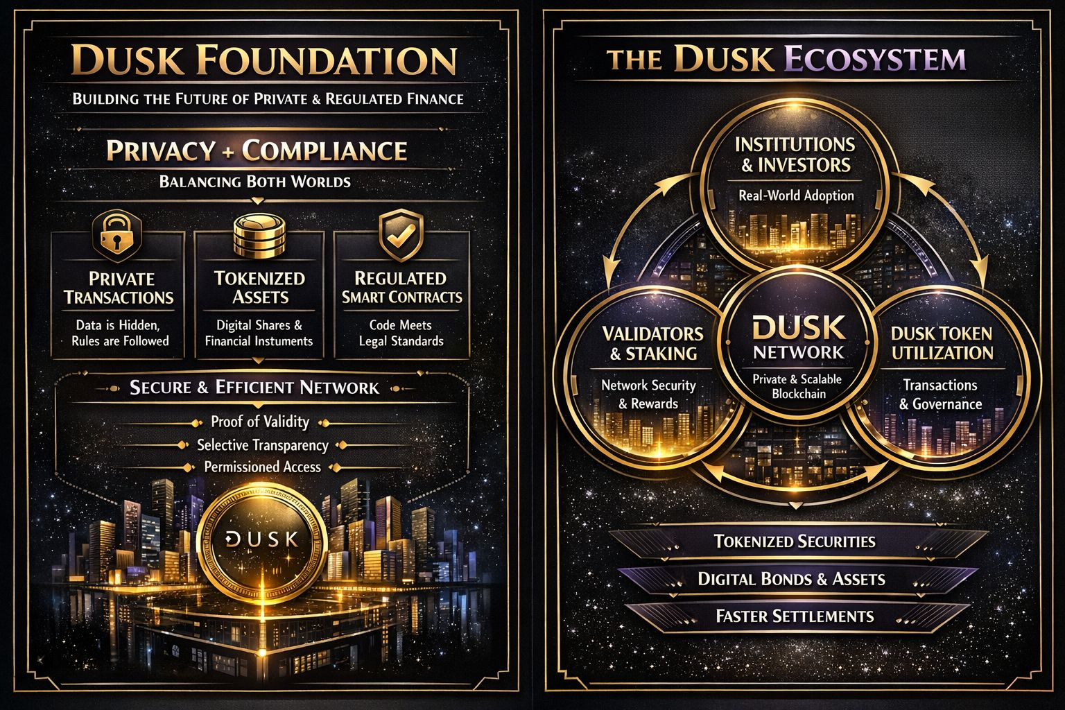 No final, a Fundação Dusk não está apenas construindo outra blockchain. Está trabalhando nas regras, ferramentas e estrutura que poderiam permitir atividades financeiras sérias viverem na cadeia de uma maneira prática. A visão não é barulhenta, mas é constante. Se eles tiverem sucesso, o valor se moverá de forma mais suave, os custos poderão cair e processos que agora levam dias poderiam acontecer muito mais rápido, enquanto ainda permanecem dentro dos limites legais. É uma longa jornada, mas o Dusk claramente está mirando em um futuro onde o blockchain não está fora do sistema, mas funcionando silenciosamente dentro dele.