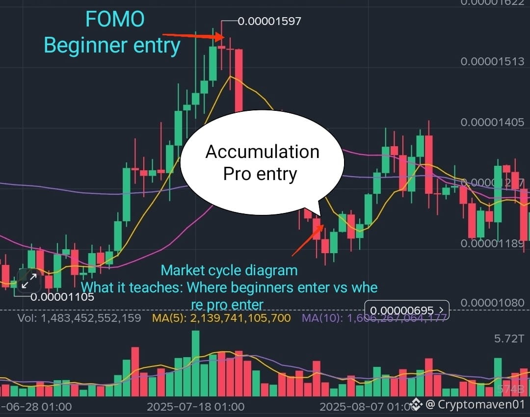 Beginners only notice the expansion phase because it is loud and fast. But the best entries are usually during quiet accumulation, when price is boring and nobody is talking about the asset.