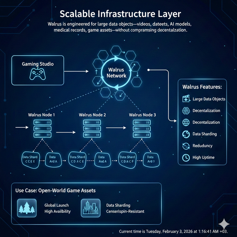 O Walrus é projetado para grandes objetos de dados—vídeos, conjuntos de dados, modelos de IA, registros médicos, ativos de jogos—sem comprometer a descentralização.