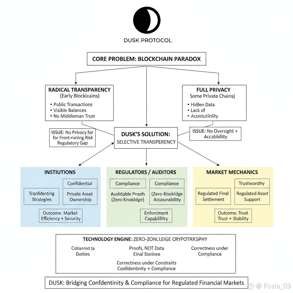 Look at real financial markets banks,funds, exchanges.Total transparency isn’t just rare; it’s dangerous.Institutions protect their trades,strategies,and clients for good reason. Leaking that info can be costly,even catastrophic.At the same time, regulators can’t do their jobs if everything’s hidden behind a wall.They need to audit,verify compliance,and enforce accountability.Fully private systems try to fix the privacy problem, but they end up sacrificing oversight.So the real trick isn’t picking privacy or transparency it’s finding a way to control who sees what, when,and with what proof.That’s where Dusk comes in.