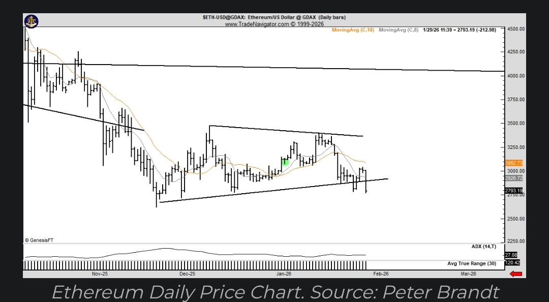 Peter Brandt compartilhou um gráfico de preços do Ethereum de 24 horas destacando a formação de um padrão de triângulo simétrico. Ele afirma que o preço quebrou e acende um sinal clássico de baixa, indicando um risco de queda adicional.