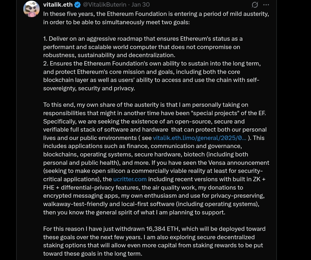 Em uma postagem no X em 30 de janeiro, Buterin confirmou que os ETH retirados seriam usados para cumprir dois objetivos. Ele planeja um roteiro agressivo para o Ethereum manter seu desempenho e escalabilidade, sem comprometer a robustez, sustentabilidade e descentralização.