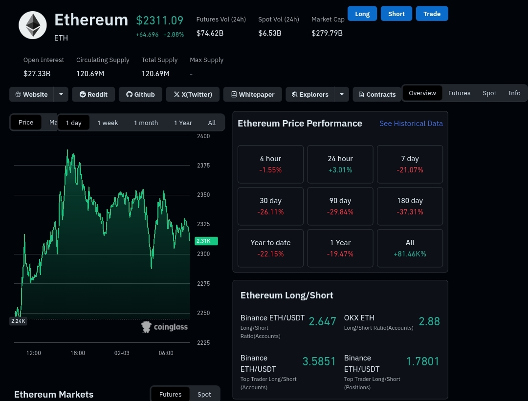 Os dados da CoinGlass indicam um sentimento de compra na queda no mercado de derivativos nas últimas horas. O interesse em aberto de futuros de ETH caiu mais de 10% para $34,89 bilhões nas últimas 24 horas. O interesse em aberto de futuros de quatro horas em CME e Binance caiu mais de 0,30% e 0,40%, respectivamente.