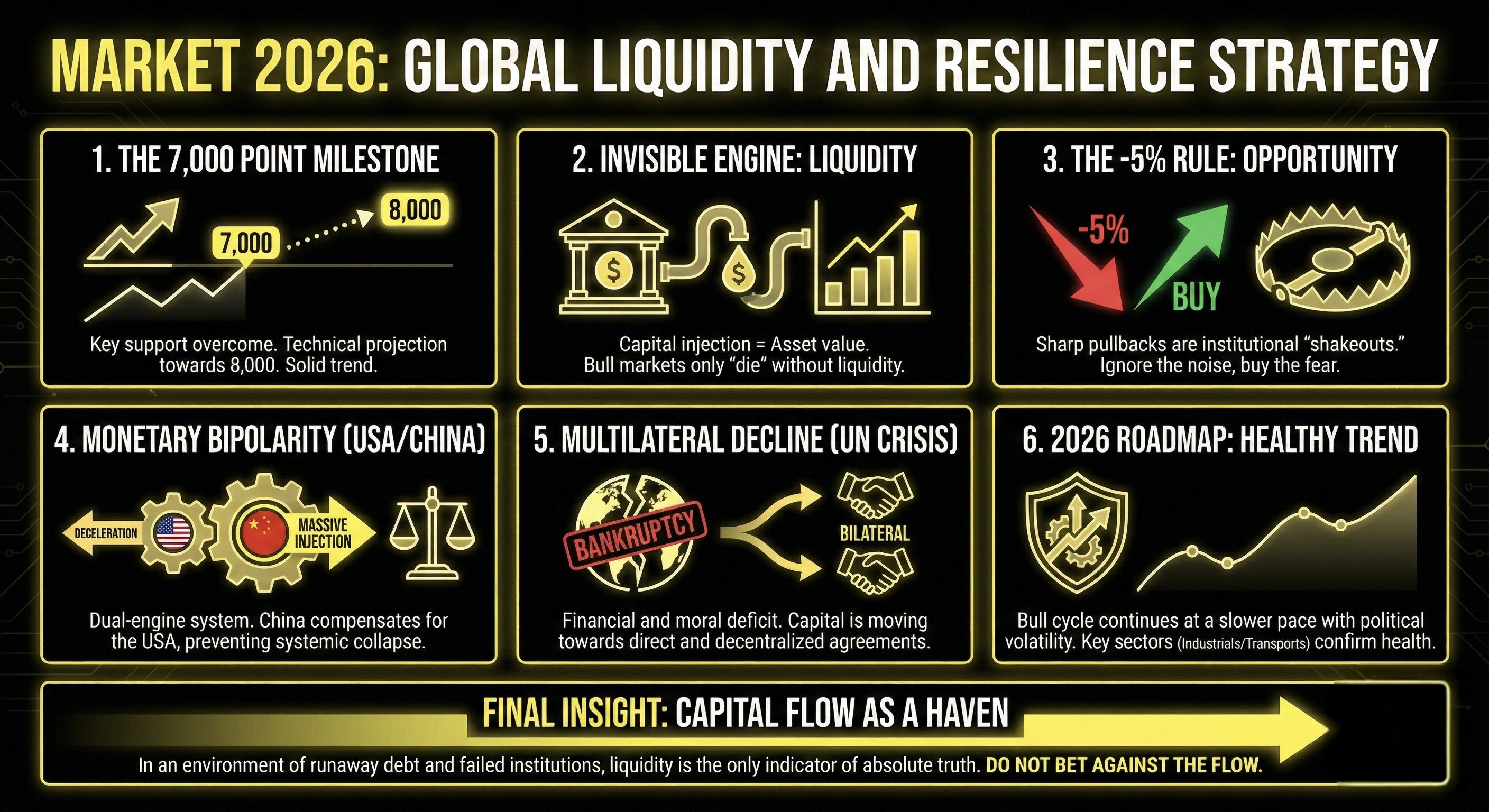 O caminho para 8.000 pontos não será uma linha reta. Ele estará repleto de manchetes alarmistas e crises institucionais. No entanto, devemos entender que, em um mundo onde as organizações internacionais estão financeiramente esgotadas e moralmente questionadas, o mercado financeiro se torna o mecanismo mais eficiente para a preservação de riqueza.