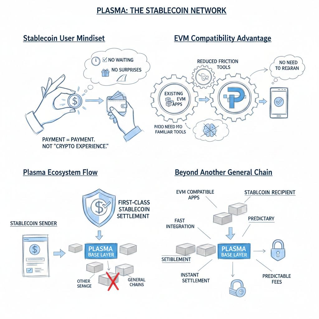 A compatibilidade com EVM é importante de uma maneira muito direta aqui, porque o Plasma não está pedindo aos construtores que reaprendam o mundo apenas para participar, e essa escolha sozinha reduz a fricção para aplicativos que já sabem como funcionar em um ambiente EVM, mas a parte mais importante é o que o Plasma faz com essa compatibilidade, porque não a está usando para se tornar 'outra cadeia geral', está usando-a como uma camada base para priorizar o assentamento de stablecoins em um design de primeira classe.