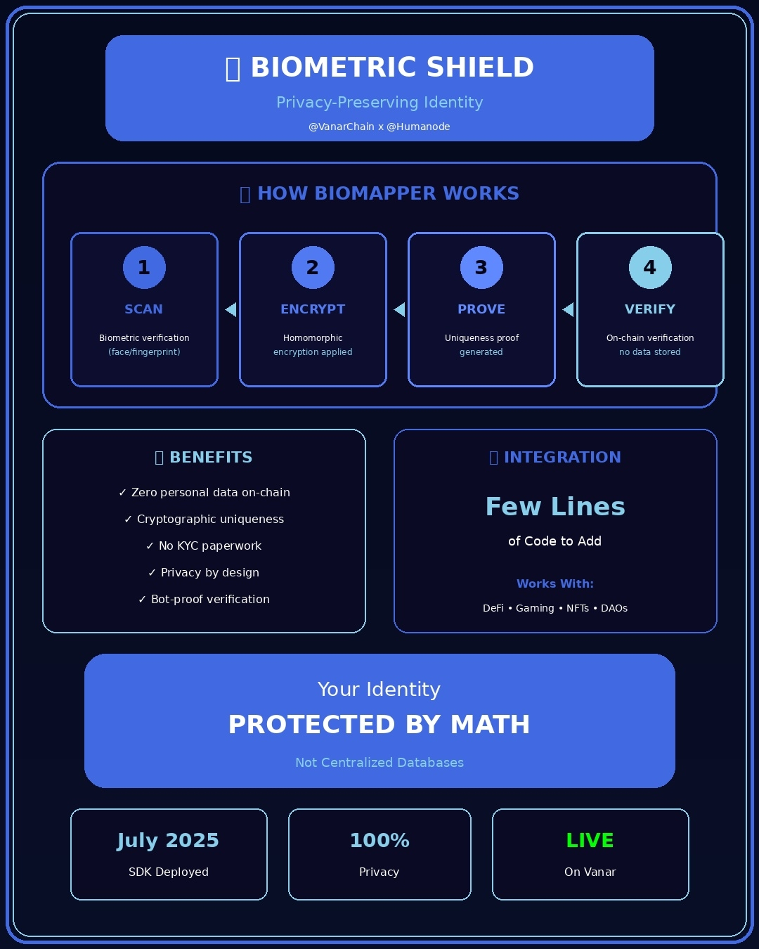 A Vanar Chain fez algo em julho de 2025. Eles adicionaram uma solução que pode realmente mudar a forma como o Web3 pensa sobre identidade e confiança. Essa solução é chamada de Humanodes Biomapper C1 SDK. É uma forma de verificar quem você é usando biometria. Mas aqui está a questão: não armazena nenhuma de suas informações biométricas na cadeia. Assim, o Humanodes Biomapper C1 SDK garante que cada pessoa tenha apenas uma conta. Isso é imposto pelo protocolo. É completamente certo por causa da matemática. A Vanar Chain e o Humanodes Biomapper C1 SDK estão garantindo que cada usuário do Humanodes Biomapper C1 SDK seja um ser humano.