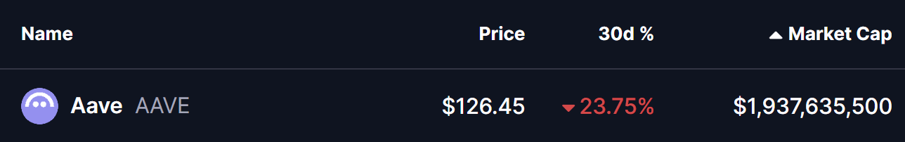 O mercado mais amplo de altcoins foi submetido a uma forte pressão de venda nos últimos dias, com o sentimento deteriorando-se rapidamente em ativos principais. Ethereum (ETH) caiu mais de 28%, definindo o tom para o mercado mais amplo. Não surpreendentemente, Aave ($AAVE) não foi poupada, perdendo quase 23% nos últimos 30 dias.