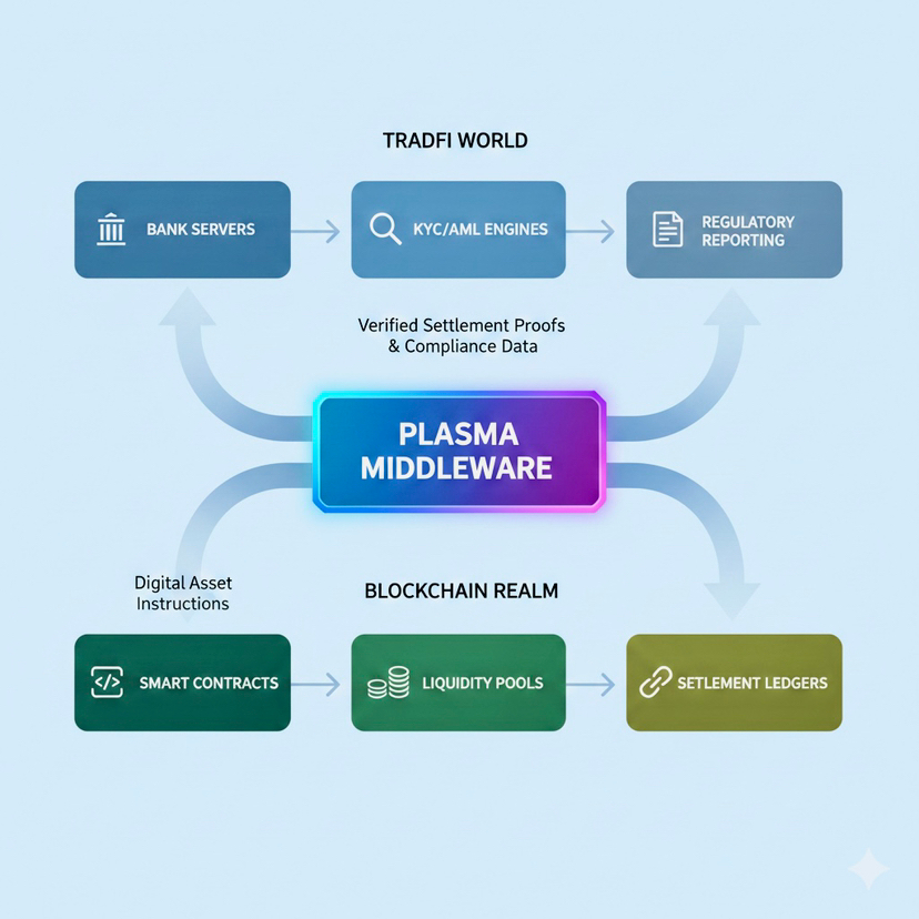 Você não verá seu nome em um extrato bancário ou piscando em uma exchange descentralizada. Ele opera em segundo plano, na transição perfeita entre dois mundos que falam idiomas diferentes. Esta é a história do middleware—especificamente, do Plasma—e como ele está silenciosamente construindo os corredores seguros e confiáveis onde as finanças tradicionais (TradFi) e o cripto finalmente se encontram.
