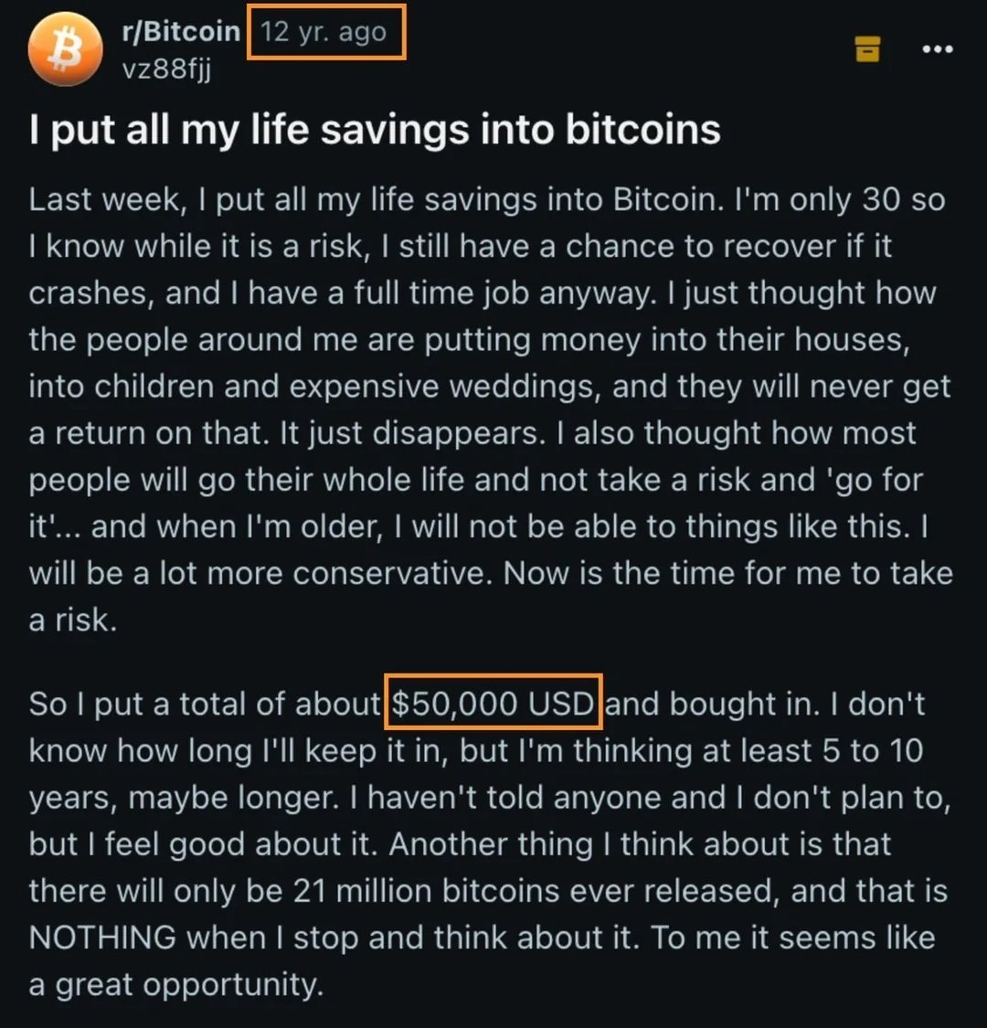 Há 12 anos, esse cara comprou $50.000 em Bitcoin. Naquela época, cada Bitcoin valia apenas $100. Hoje, a compra de Bitcoin de $50.000 dele vale mais de $50 milhões. Que lenda!