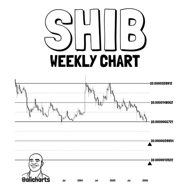 Em comentário separado sobre o mercado, Ali Martinez afirmou que a estrutura do Shiba Inu depende de manter-se acima do nível de $0.0000066721, que marca um suporte semanal importante no gráfico. Esta zona tem atuado repetidamente como um piso de demanda durante consolidações anteriores.