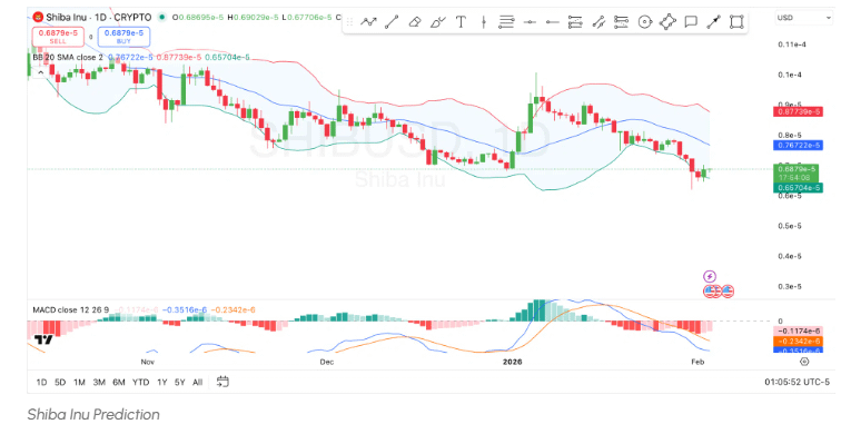 Shiba Inu recentemente se recuperou de sua Banda de Bollinger inferior no gráfico diário, que estava atuando como a zona de suporte imediata, o que significa que os touros defenderam esse suporte. Enquanto o SHIB permanecer acima desse limite inferior de volatilidade, situado em $0.00000657, a pressão para baixo pode permanecer contida, embora um fechamento diário abaixo dele sinalizaria uma fraqueza renovada. Isso também poderia abrir a porta para um recuo mais profundo em direção a zonas de consolidação anteriores, como $0.0000062.