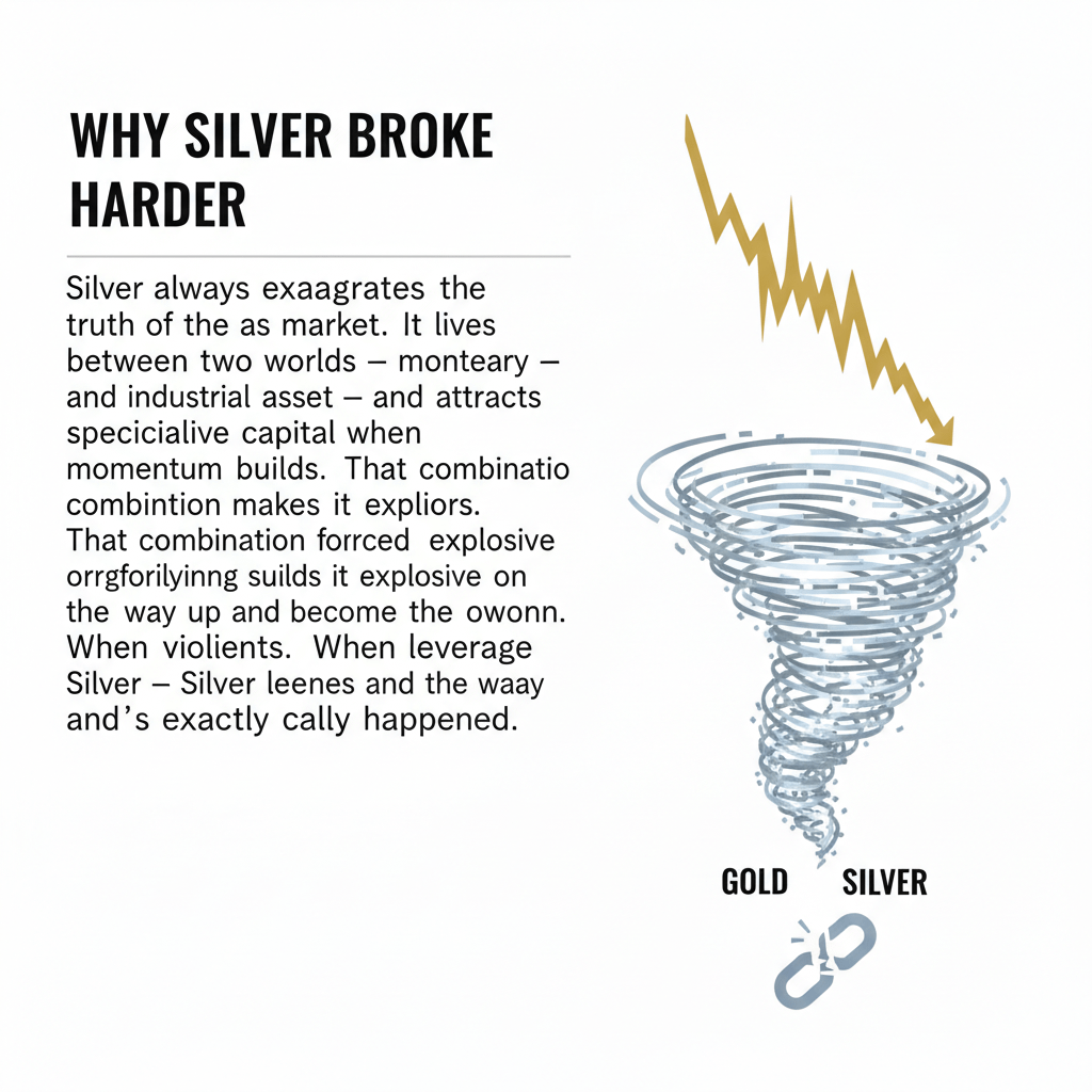 Uma vez que o preço começou a cair, as ordens de stop começaram a ser acionadas. A liquidez diminuiu. O que se seguiu não foi venda em pânico por detentores de longo prazo, mas liquidação forçada por participantes alavancados. O ouro caiu em segmentos acentuados. A prata se desfez violentamente. Isso foi mecânico, não emocional. Chamadas de margem não se importam com narrativas.