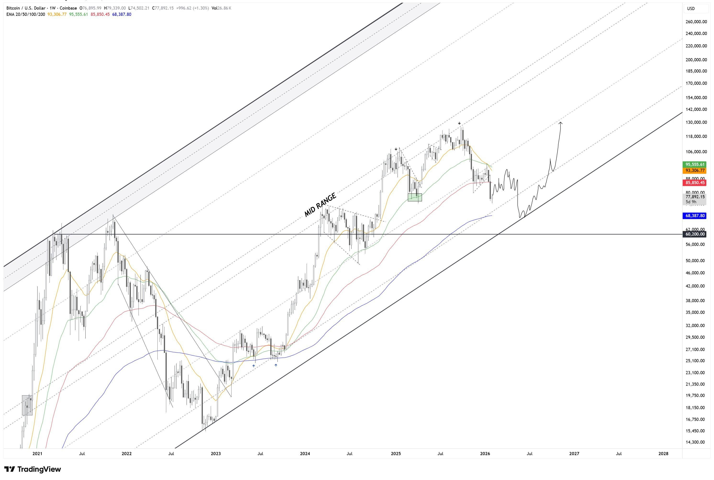 Com base nesta estrutura, adicionei uma projeção de alto nível que destaca onde o mercado pode buscar equilíbrio. O suporte macro atual está em torno da região de $60k, que continua sendo o nível estrutural mais relevante se a pressão de baixa continuar.
