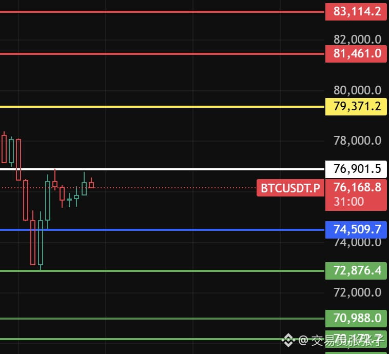 如果今天1-2小时级别收不上76900上方,那说明小级别反弹没有力度,再次下探下方支撑位留意74500-72880-71000这几个位置附近!#BTC走势分析