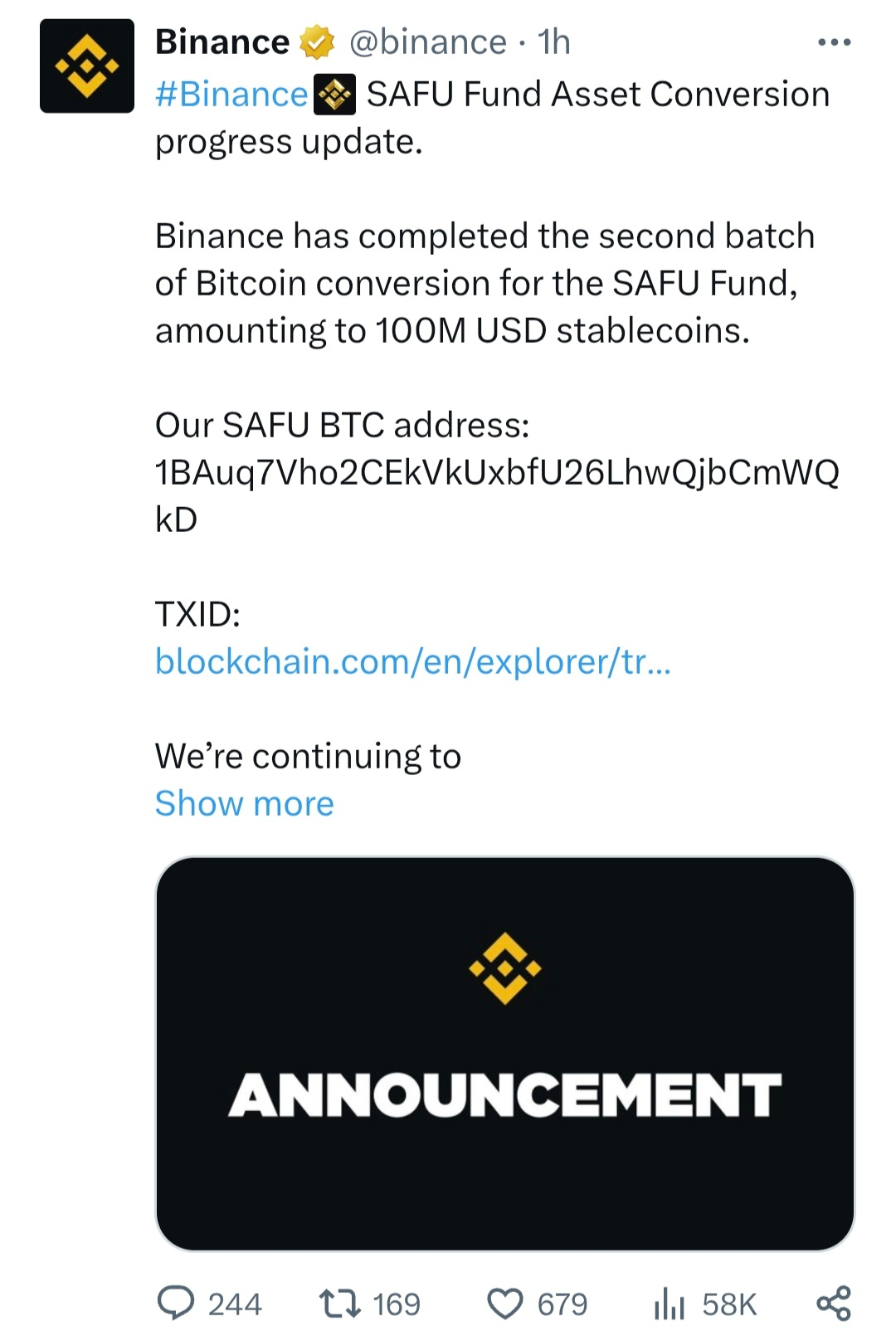A Binance confirmou mais tarde a transação, afirmando que $100 milhões em stablecoins foram convertidos e que mais aquisições de BTC seguiriam até que a meta total de $1 bilhão seja alcançada.