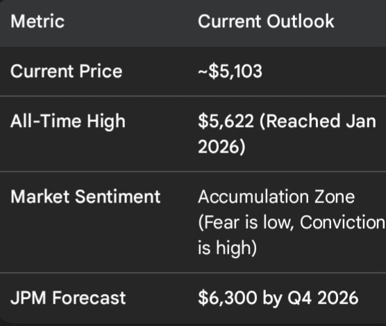 A recente correção de $5.600 para o atual nível de $5.100 é um presente. J.P. Morgan acabou de aumentar sua meta para o final de 2026 para $6.300/oz, citando "diversificação de reserva não esgotada."