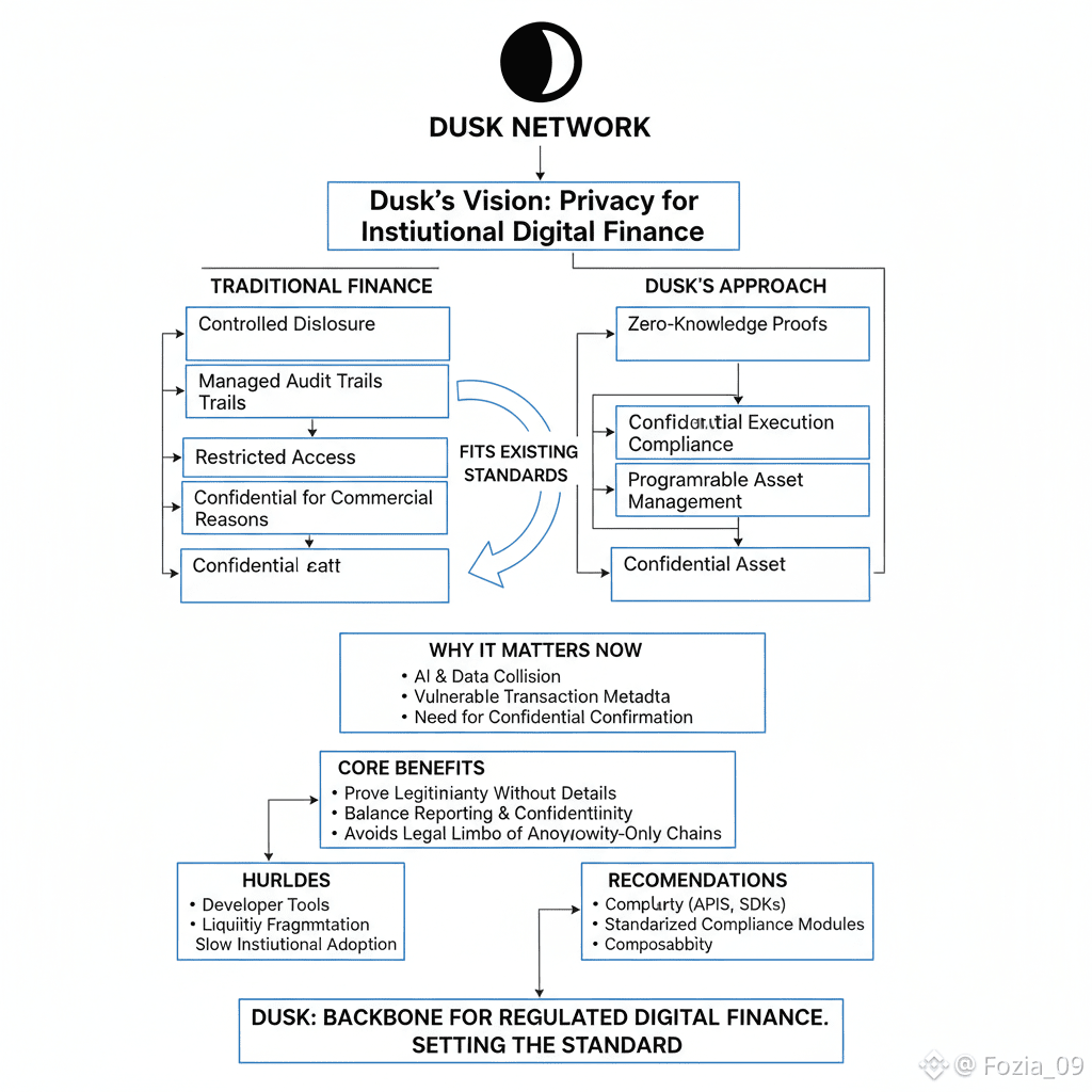 Structurally,Dusk is playing the long game. It’s not chasing the latest market frenzy. Banks,asset managers,and fintechs are inching toward tokenizing assets,issuing digital securities,and settling trades on chain but they won’t take the leap without privacy, compliance,and audit features built in.Dusk’s focus on programmable compliance and confidential asset management hits these requirements head on.Instead of forcing institutions to adjust to the radical transparency of crypto,Dusk bends blockchain to fit the standards institutions already demand.That’s a big shift in how these systems are designed.