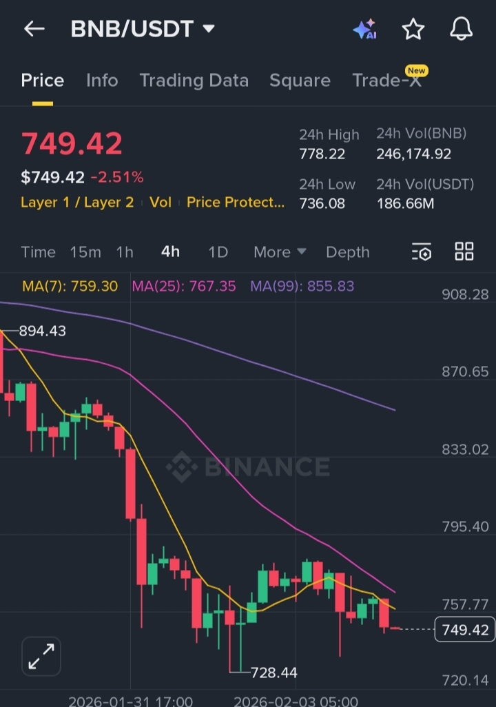 BNB is currently trading near $749 retracing from recent highs while maintaining a strong higher-timeframe structure. Even during broader market weakness, BNB continues to outperform many Layer-1 assets — a reflection of Binance’s ecosystem dominance, utility demand, and consistent burn mechanics.