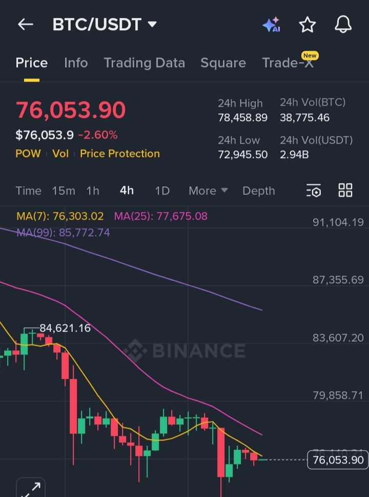 Bitcoin is trading around $76,000, holding above its recent liquidity sweep near $72,900. On the 4-hour timeframe, BTC remains below the MA(25) and MA(99), confirming that the market is still technically in a corrective structure. However, the rejection from sub-$73K levels indicates aggressive dip-buying by larger participants.