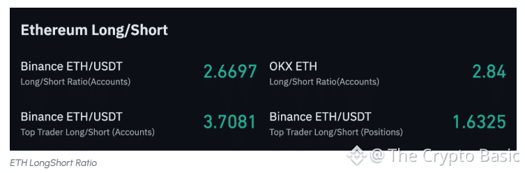 On the derivatives side, Ethereum’s market sentiment is currently leaning towards the long side, as reflected in the long/short ratios across different platforms.