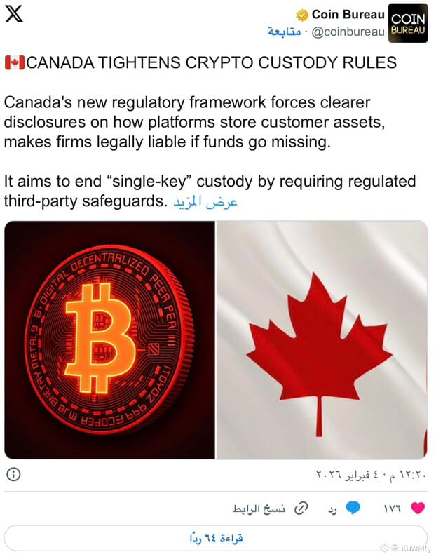 تعمل كندا على تعزيز أمان حفظ الأصول الرقمية عبر قواعد جديدة لمنصات الأصول الرقمية. في 3 فبراير 2026، أصدرت المنظمة الكندية لتنظيم الاستثمارات (CIRO) إطار حفظ الأصول الرقمية. ويلزم الإطار المنصات بتوضيح كيفية تخزين أموال العملاء بشكل واضح، كما يحمل الشركات المسؤولية إذا اختفت الأموال.