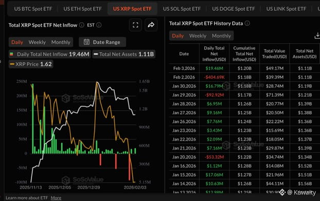 عكست صناديق الاستثمار المتداولة $XRP المدرجة في الولايات المتحدة التقلبات في سوق العملات المشفرة، حيث جذبت حوالي 19 مليون دولار من التدفقات يوم الثلاثاء بعد تدفقات خفيفة قدرها 405,000 دولار يوم الاثنين. تشير هذه الانتعاشة إلى تجدد الاهتمام المؤسسي، مما يجلب التدفق التراكمي إلى 1.2 مليار دولار والأصول الصافية تحت الإدارة إلى 1.11 مليار دولار.