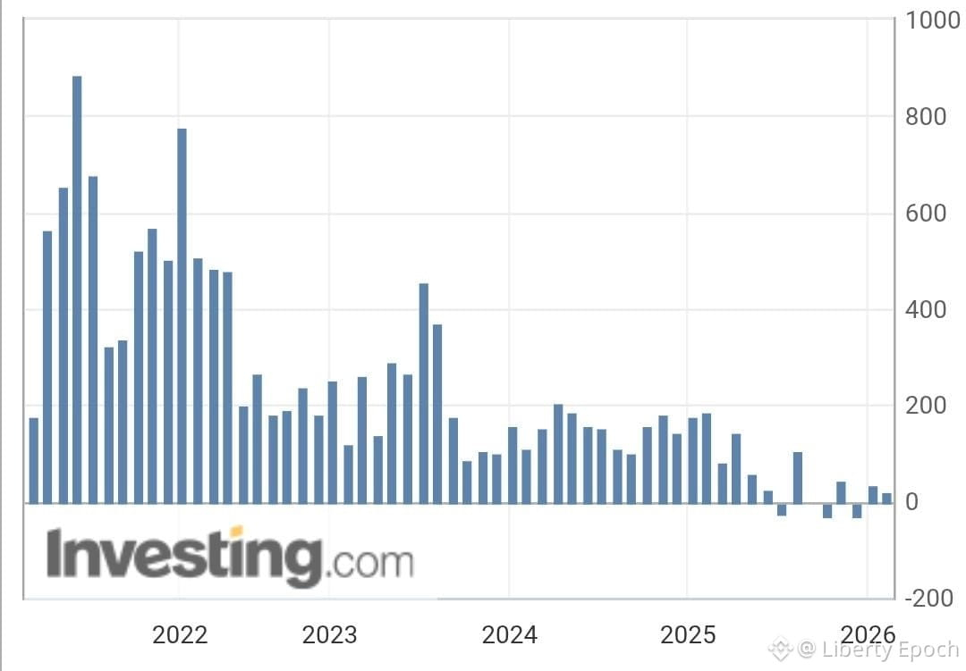 $BTC $USDC $PAXG O início de 2026 trouxe sinais claros de desaceleração no mercado de trabalho norte-americano. Os dados do Relatório Nacional de Emprego da ADP mostram que, após o forte crescimento observado em meados de 2024, o setor privado entrou em uma fase de enfraquecimento ao longo de 2025 e agora em 2026 apresenta quedas mais acentuadas. O gráfico revela meses consecutivos de perda líquida de vagas, algo que preocupa investidores e analistas, já que o emprego é um dos principais motores da economia.
