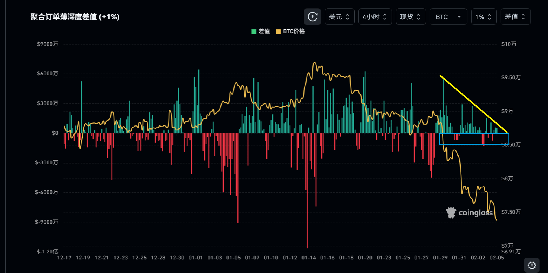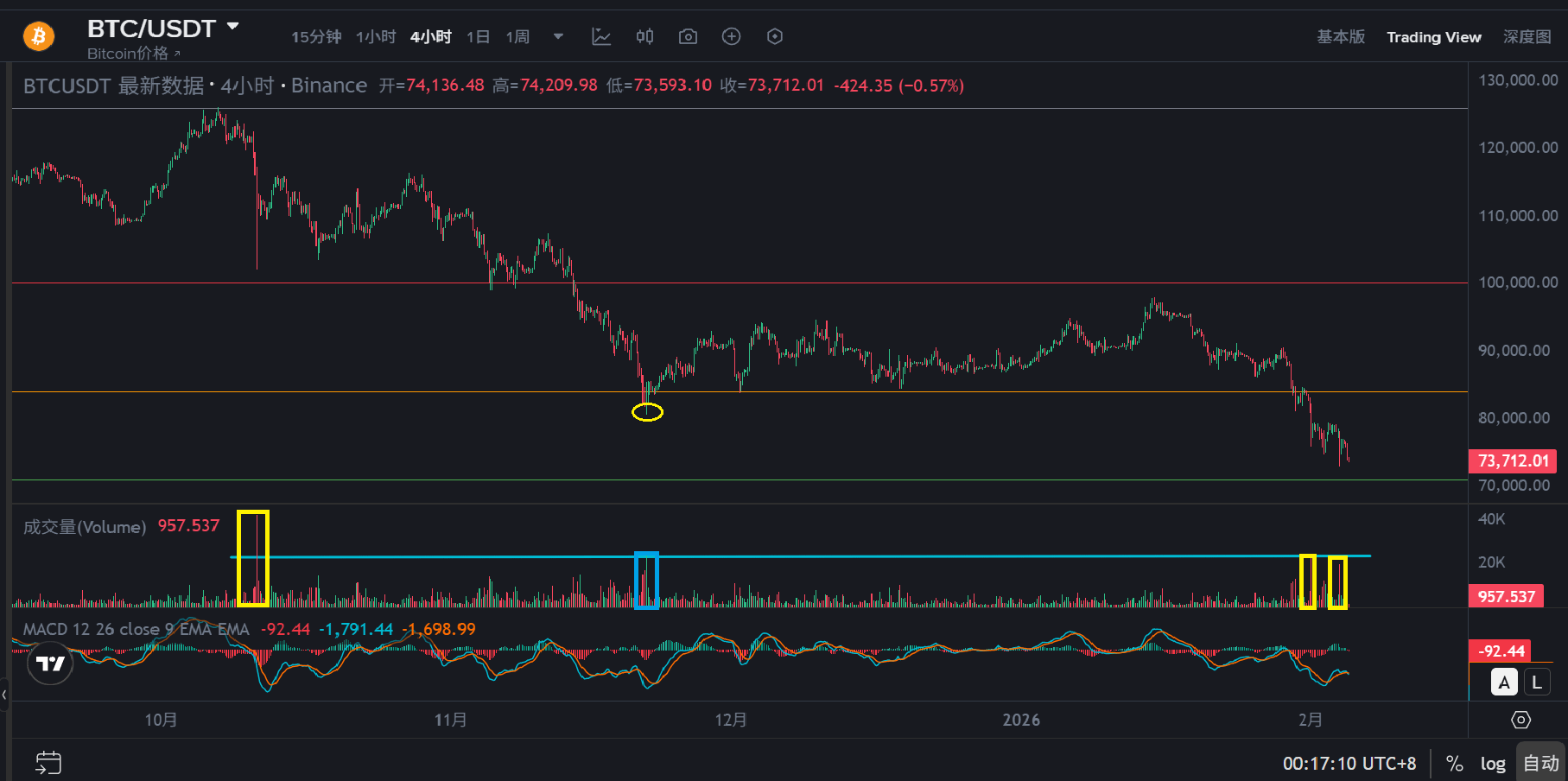 Em segundo lugar, vamos ver a situação das mudanças de força da quantidade de compra e venda nos últimos quatro meses no nível de quatro horas. A rápida queda em cascata em 11 de outubro de 2025 resultou em uma quantidade principal de venda, estabelecendo a direção da tendência de queda de médio prazo do BTC; posteriormente, o BTC continuou a cair para acima de 80 mil; em 21 de novembro de 2025, apareceu uma quantidade secundária de compra, seguida por uma onda de recuperação entre 80 mil e 98 mil; no entanto, nos dias 1 e 4 de fevereiro deste ano, apareceram duas quantidades secundárias de venda, indicando que houve uma venda significativa em 80 mil e 76 mil, os vendedores estão em força absoluta, enquanto os compradores se mostraram muito fracos, é muito provável que 75 mil não seja o fundo do mercado em baixa, em seguida, o BTC continuará a cair.