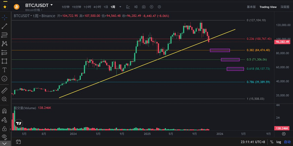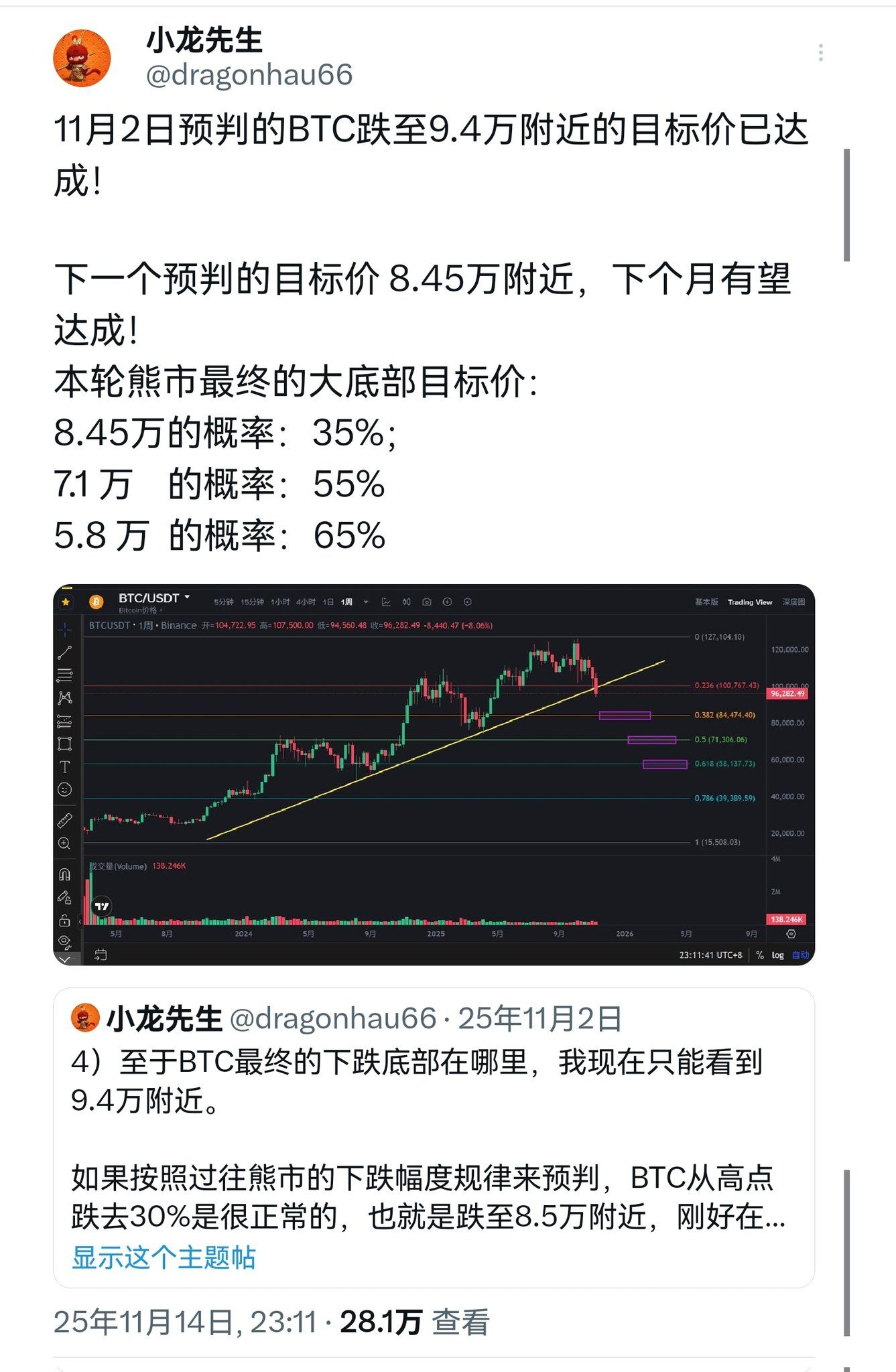 Eu twittei em 14 de novembro de 2025, prevendo antecipadamente a tendência de queda do BTC no médio prazo, elaborando previamente os preços-chave da queda do BTC. Para mais detalhes, veja o gráfico de previsão abaixo, que ainda é muito eficaz. Este tweet recebeu 280.000 curtidas.