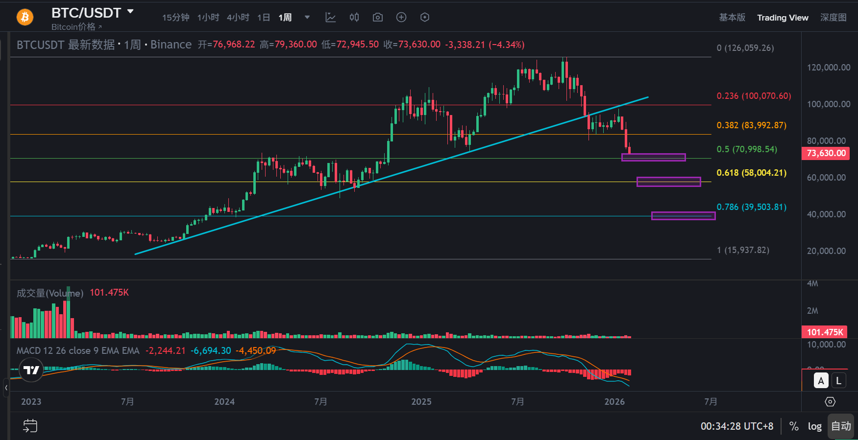 Por fim, vamos prever a grande base de mercado para os próximos seis meses a partir do gráfico semanal do BTC. De acordo com a retração de Fibonacci do ponto alto de 127 mil ao ponto mais baixo histórico de 15.6 mil, a posição de 0.5 é considerada um nível de fraca atratividade, ou seja, é muito provável que cerca de 70 mil não seja o preço de fundo do mercado; a posição de 0.618 é considerada um nível de forte atratividade, que puxará o preço para finalmente cair para perto de 58 mil, aqui é uma área de alta liquidez e também um forte nível de suporte. A verdadeira grande base do mercado pode nascer perto de 58 mil, e em casos extremos, só cairá para a posição de 0.786, ou seja, perto de 40 mil. Atualmente, não posso dar uma resposta precisa se a grande base do mercado é 58 mil ou 40 mil, precisaremos esperar até que o BTC caia para 58 mil para analisar a direção dos fluxos de capital das instituições ETF, a força e fraqueza da quantidade de compra e venda, e os dados de valores de compra no livro de ordens para poder fazer uma previsão.