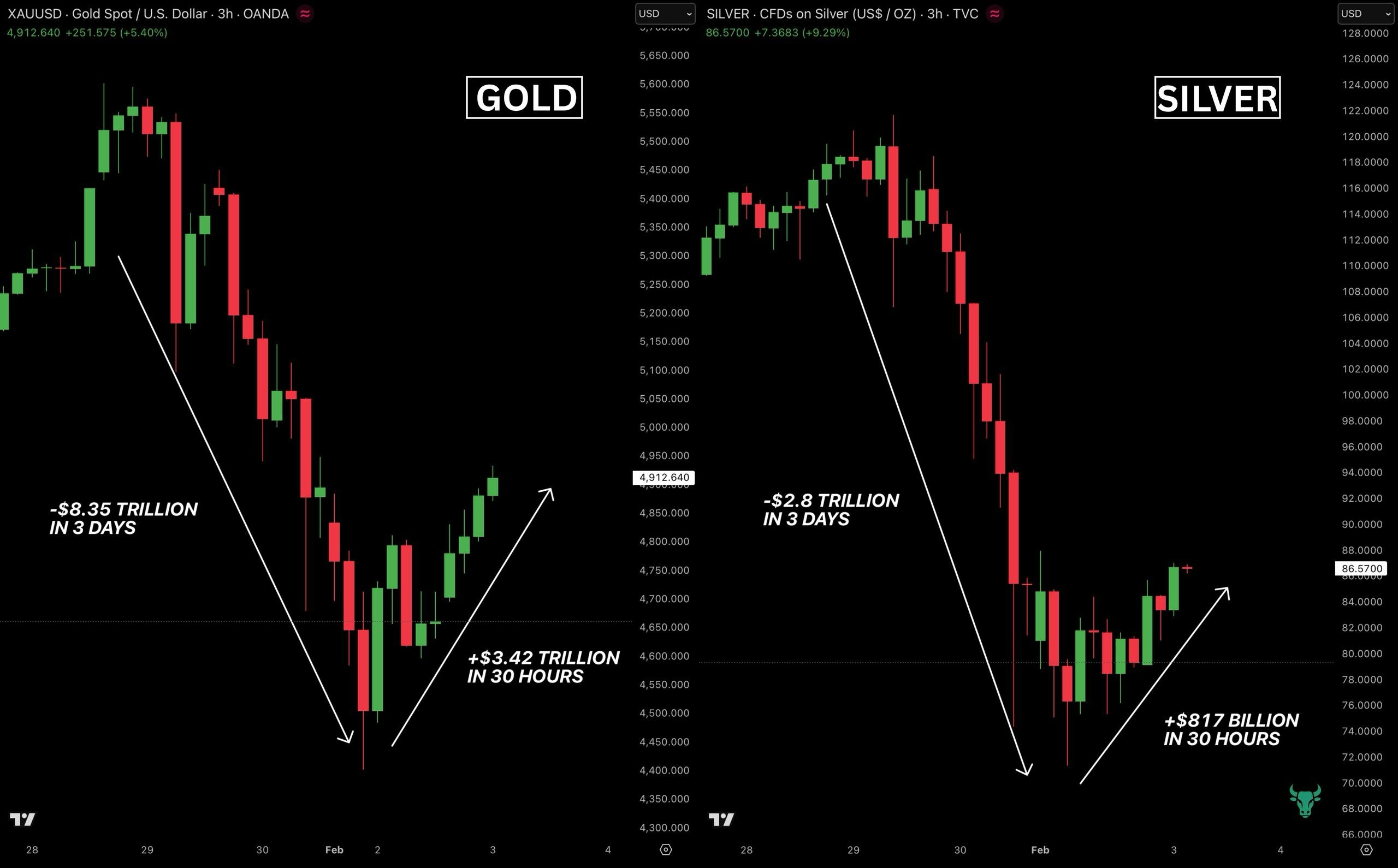 Após uma venda brutal que apagou mais de $11 trilhões 💥 de metais preciosos, o ouro e a prata realizaram um poderoso retorno — recuperando quase $4 trilhões em apenas 30 horas ⏱️💰