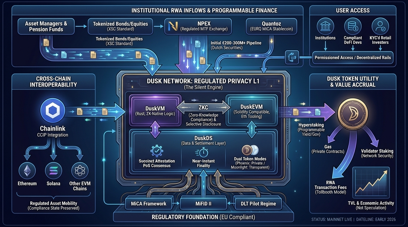 Strategic focus in 2026 is laser-sharp on Europe and regulatory moats. MiCA gave the EU a framework; Dusk aligned early. Partnerships prove it: NPEX for tokenized securities trading (dApp rolling out Q1 with initial €200–300M+ in assets), Chainlink for cross-chain standards (CCIP enabling compliant transfers to other EVM chains), Quantoz for regulated stablecoins. Mainnet upgrades emphasize stability, speed, and developer onboarding. Dusk Pay (MiCA-compliant payments) and Dusk Vault (institutional custody) are in flight. The bet is that as RWAs explode projected trillions in tokenized assets by decade's end the compliant, private Layer 1 wins the institutional allocation.