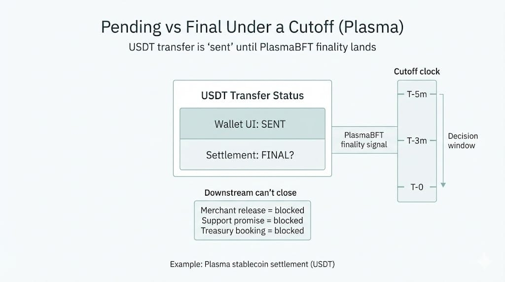 Alguém pergunta se podemos bloquear o envio até que a citação confirme. Ninguém responde imediatamente, porque todos podem ouvir como isso se transforma: checkout sem gás que para em uma atualização de citação. O ponto todo de escolher o Plasma para liquidação de stablecoin era parar de fingir que esperar é normal.