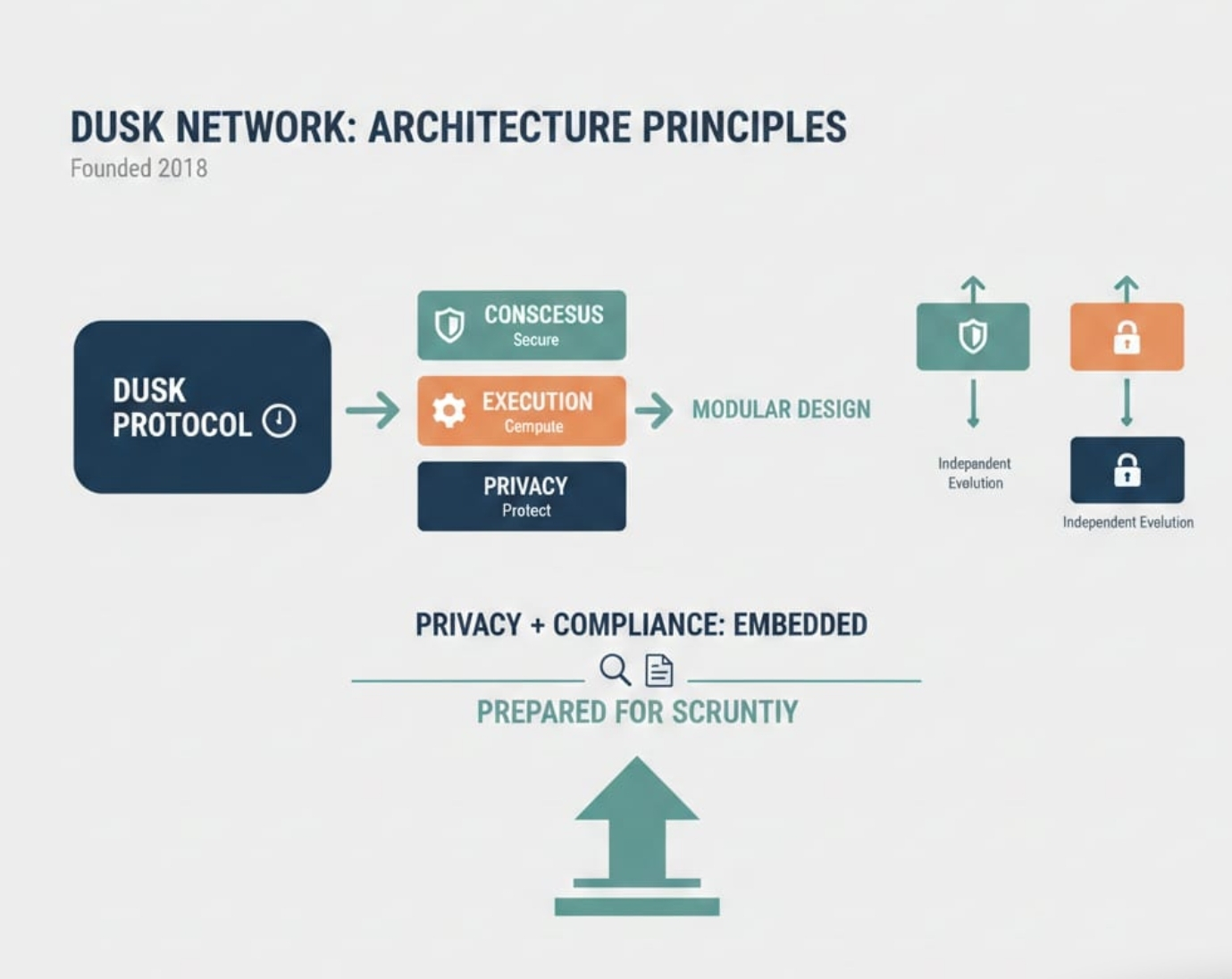 @Dusk feels like it was born from experience rather than excitement. Founded in 2018, it carries the quiet confidence of a system that understands what it is building and who it is building for. At its foundation, the network works by separating responsibilities that are often dangerously combined elsewhere. Consensus exists to secure. Execution exists to compute. Privacy exists to protect. These elements are modular by design, allowing each part to evolve without putting the whole system at risk. Privacy is not decorative and compliance is not optional. They are embedded into the protocol itself. I’m seeing an architecture that assumes scrutiny will come and prepares for it instead of avoiding it.