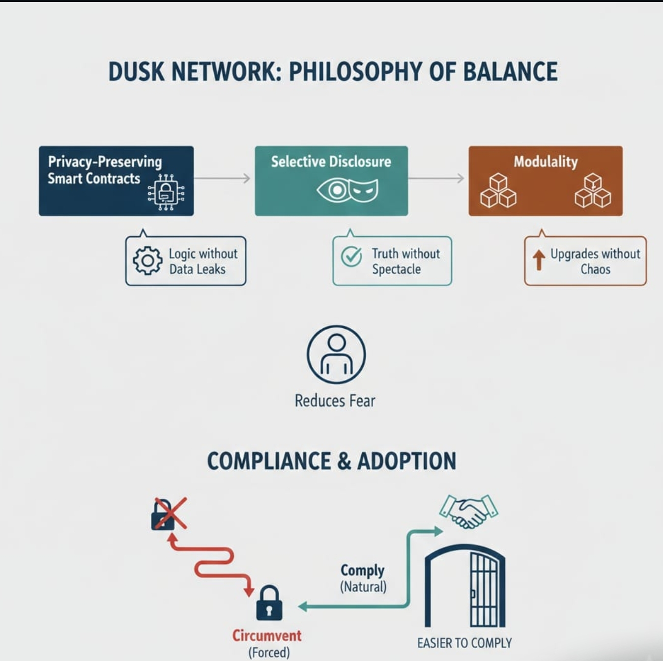 The thinking behind Dusk feels deeply human. Instead of chasing extremes, the design chooses balance. Privacy preserving smart contracts allow logic to function without leaking data. Selective disclosure allows truth without spectacle. Modularity allows upgrades without chaos. Every choice points to a belief that infrastructure should reduce fear, not introduce it. I’m drawn to how this removes ideological tension. Institutions are not framed as outdated or slow. They’re treated as careful for good reason. If it becomes easier to comply than to circumvent, adoption stops feeling forced and starts feeling natural.