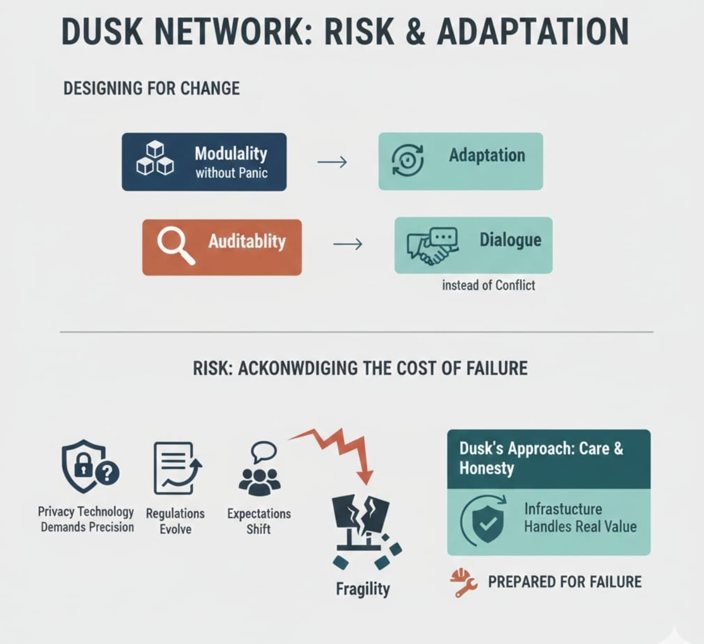 Risk is treated with respect rather than denial. Privacy technology demands precision. Regulations evolve. Expectations shift. Ignoring these realities creates fragility. Dusk addresses this by designing for change. Modularity allows adaptation without panic. Auditability allows dialogue instead of conflict. I’m convinced this honesty is not caution but care. Infrastructure that handles real value must acknowledge the cost of failure before it happens.
