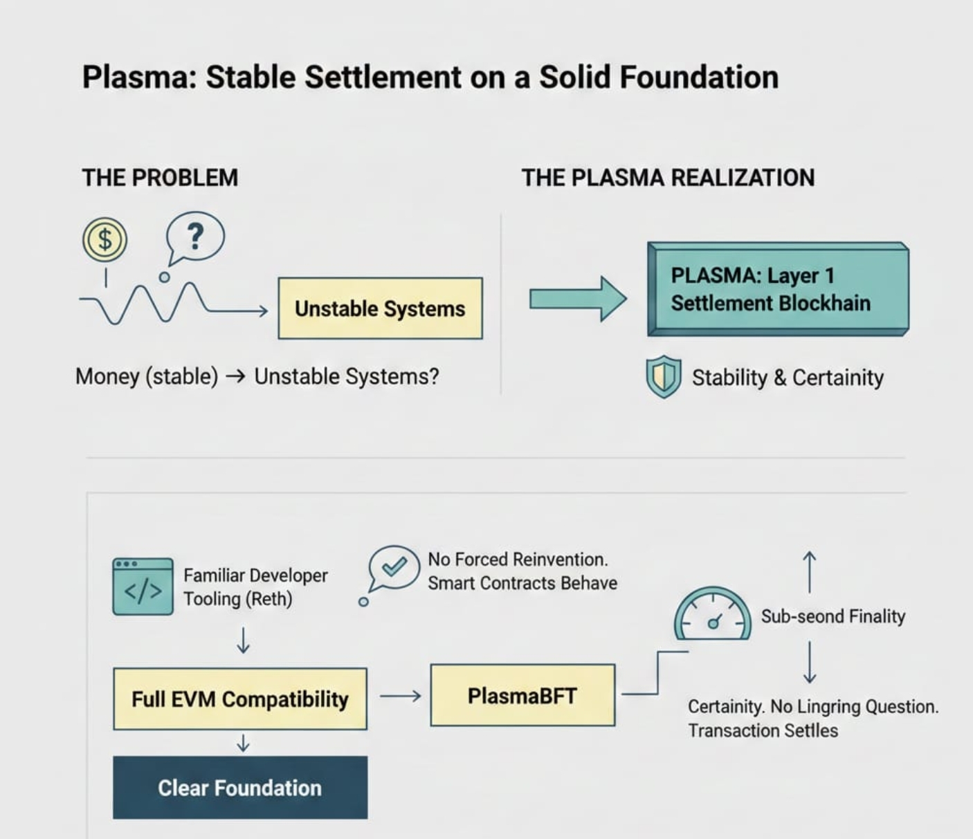 @Plasma feels less like a product launch and more like a quiet realization. The realization that money which is meant to stay stable should not have to travel through unstable systems. At its core Plasma is a Layer 1 blockchain built for settlement above all else. Not for constant experimentation and not for spectacle. It starts from a clear foundation. Full EVM compatibility through Reth ensures that what developers already know continues to work. There is no forced reinvention. Smart contracts behave as expected. Tooling feels familiar. That choice alone removes a layer of fear. PlasmaBFT delivers sub second finality and that speed is not about racing other chains. It is about certainty. The moment a transaction is sent there is no lingering question. It settles and the mind moves on.