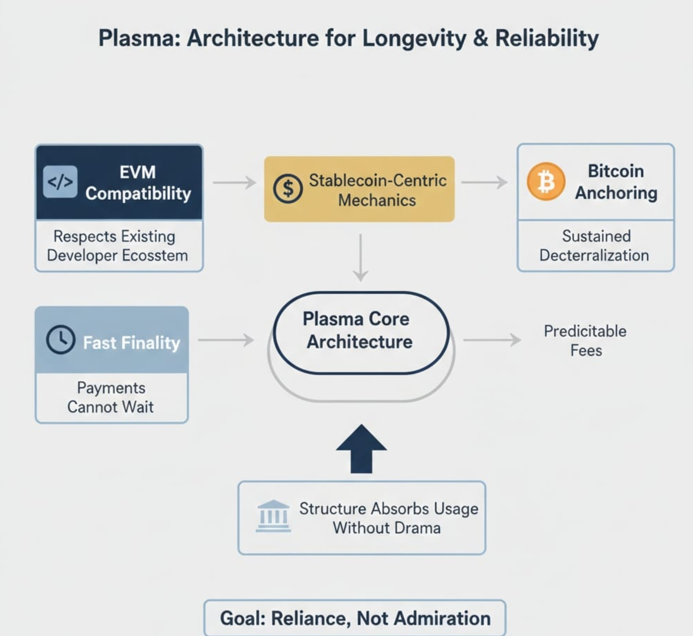 The architecture reflects a mindset that values longevity. EVM compatibility respects the existing developer ecosystem. Fast finality exists because payments cannot wait without consequence. Stablecoin centric mechanics exist because fees should not surprise people after the fact. Bitcoin anchoring exists because decentralization is not something you declare once and forget. They’re building a structure that can absorb usage without drama. If it becomes widely adopted it will be because people rely on it rather than admire it.