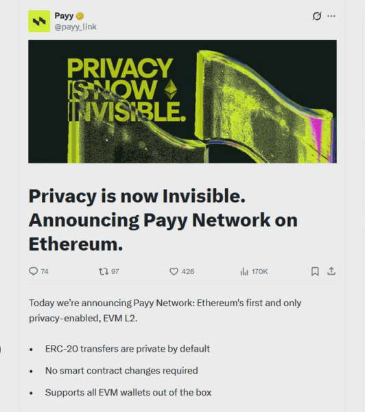 $ETH Crypto project Payy, which operates a privacy-focused wallet alongside a crypto banking card, has just launched a privacy-enabled Ethereum layer 2.
