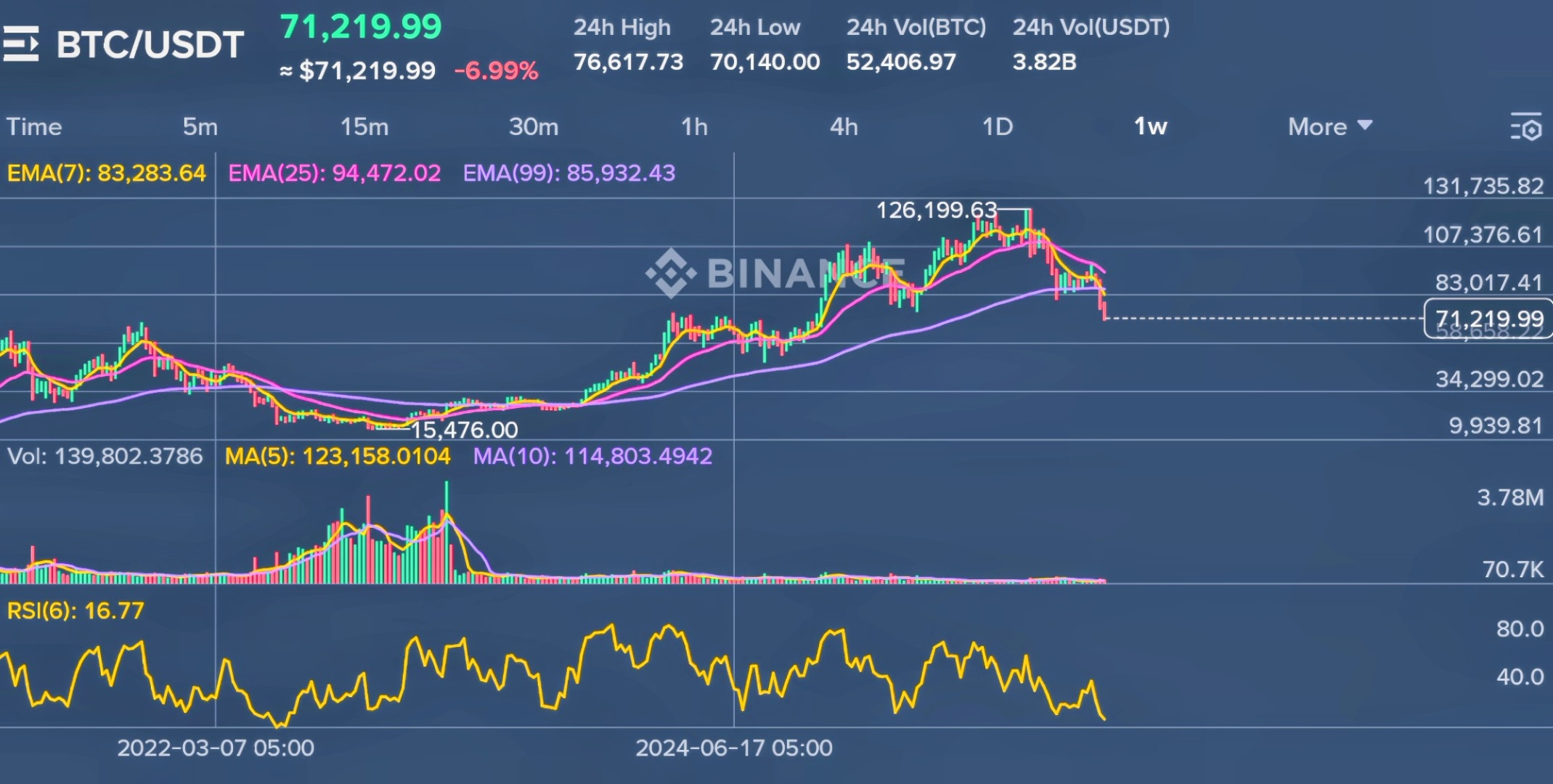 • Indicators & Moving Averages: Price is well below the 50-week SMA (~$87,000) and 20-week SMA (~$77,000), locking in bearish bias. RSI is oversold at ~27, hinting at seller exhaustion for a possible short-term bounce, but MACD's bearish cross and declining volume warn of more downside.