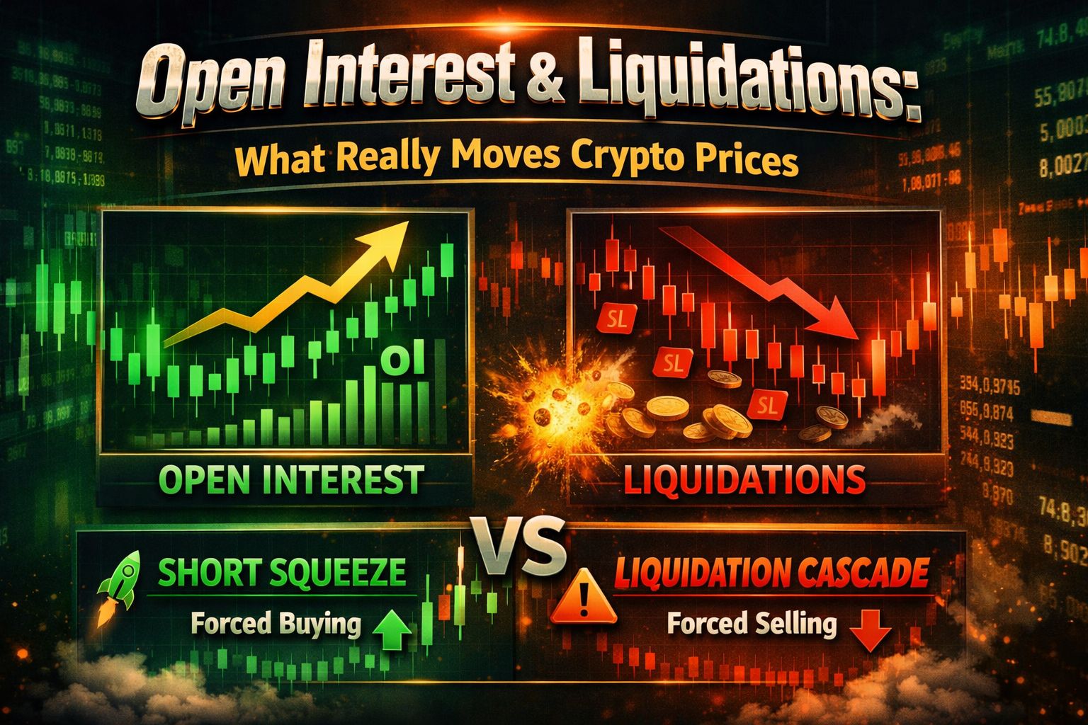 Two forces quietly drive most violent crypto moves: Open Interest and Liquidations.