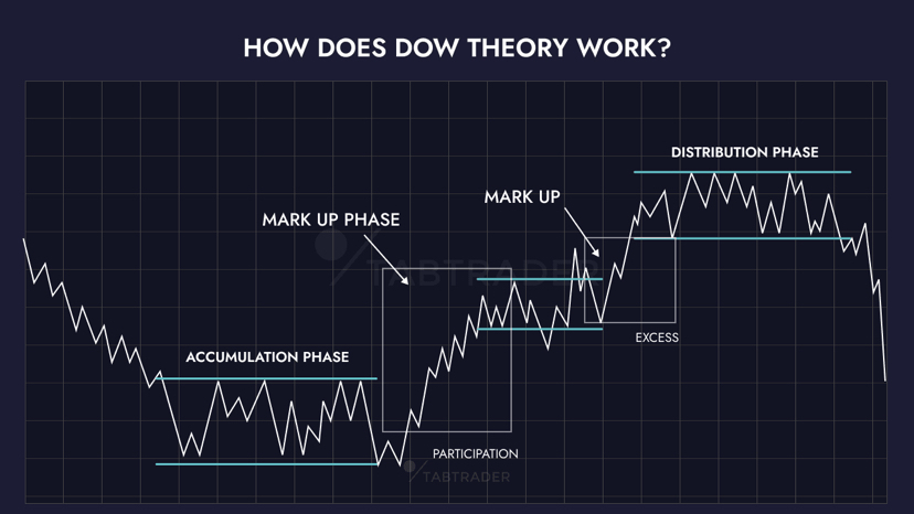 Чарльз Доу аналізував Промисловий індекс (Industrial) та Залізничний індекс (Railroads). Він вважав: якщо заводи виробляють товари (ріст Industrial), але залізниця їх не перевозить (падіння Transportation) — економіка хвoріє.
