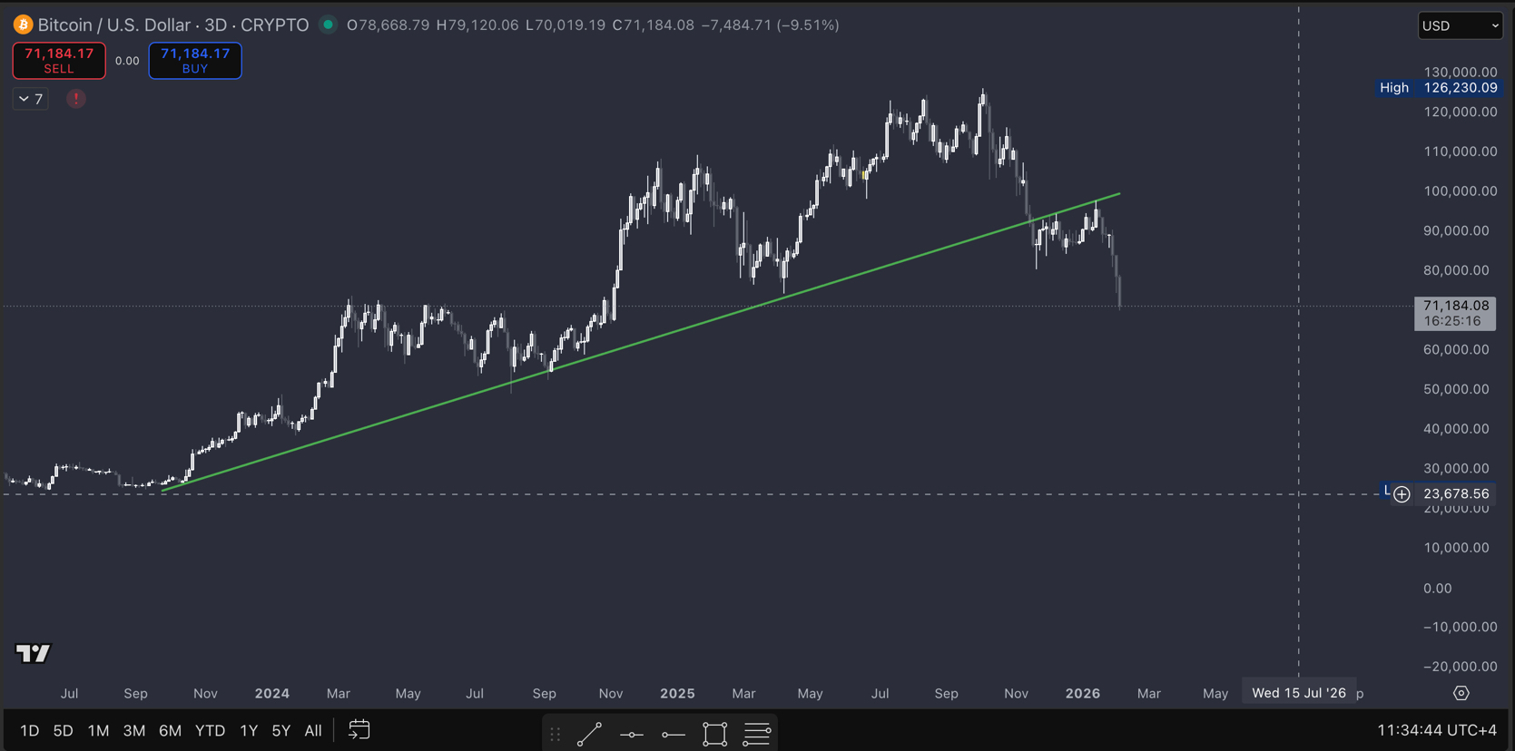For almost three years, Bitcoin respected its long-term uptrend that started near $16,000 in 2022. Every time price touched that trendline, we saw new highs.