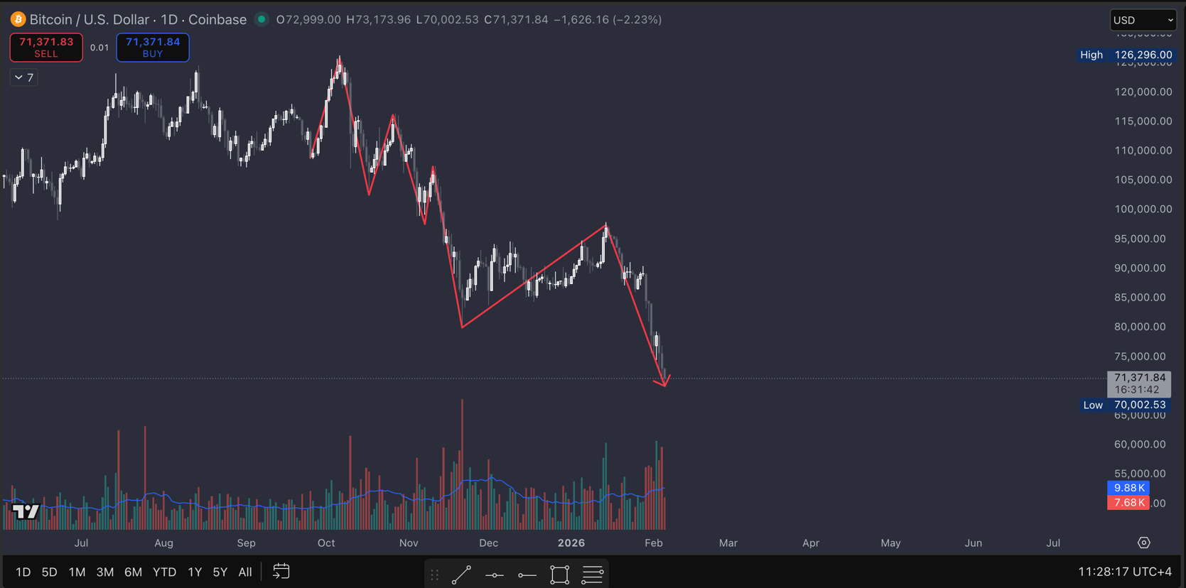 Last year Bitcoin was making new all-time highs almost every month. Then we topped around $125,000. Since then, price has been in a steady downtrend, forming lower highs again and again.